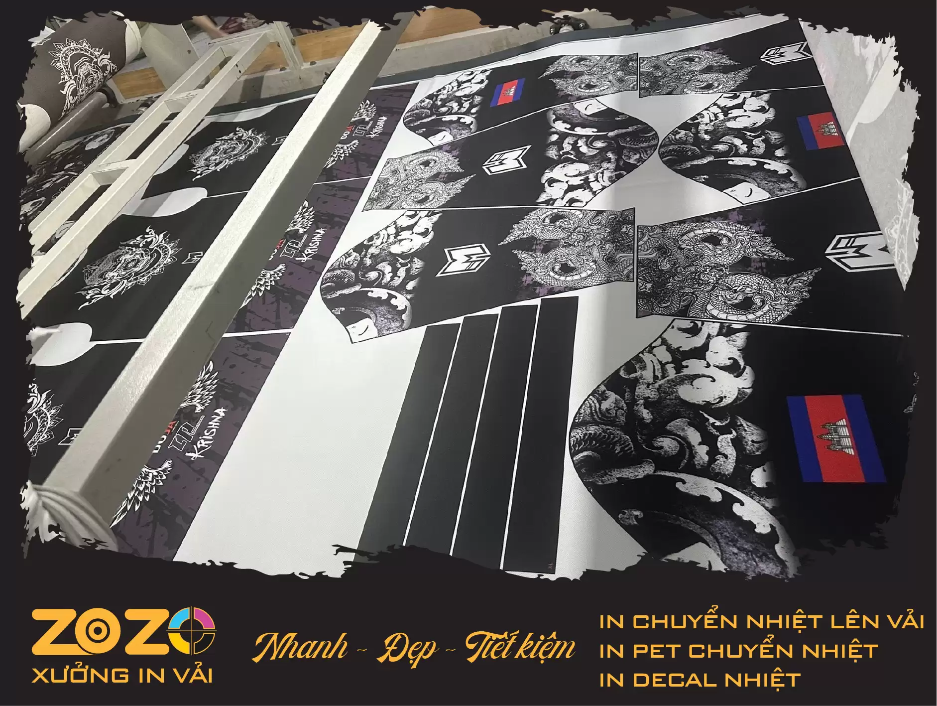 Tại Xưởng In Vải Chuyển Nhiệt ZOZO, chúng tôi sở hữu hệ thống máy in chuyển nhiệt khổ lớn và máy ép hiện đại, đáp ứng yêu cầu in ấn trên nhiều loại vải bán thành phẩm với màu sắc sắc nét, bền đẹp và đúng thiết kế.